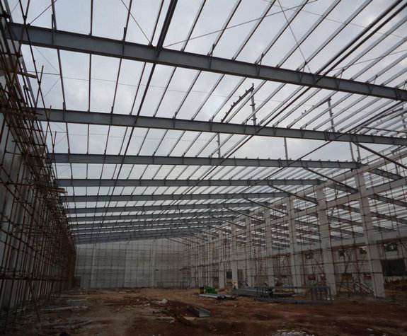 如今最通常門式剛架房屋鋼結構選用H型鋼作為主要構件材料制作。門式剛架在豎向均布荷載作用下,剛架梁與柱連接處、梁跨中處彎矩都較大。在水平荷載作用下,剛架角部也彎矩比較大,其他部位彎矩較小。既而可采用大變小截面的H型鋼,較等截面型鋼節約材料。